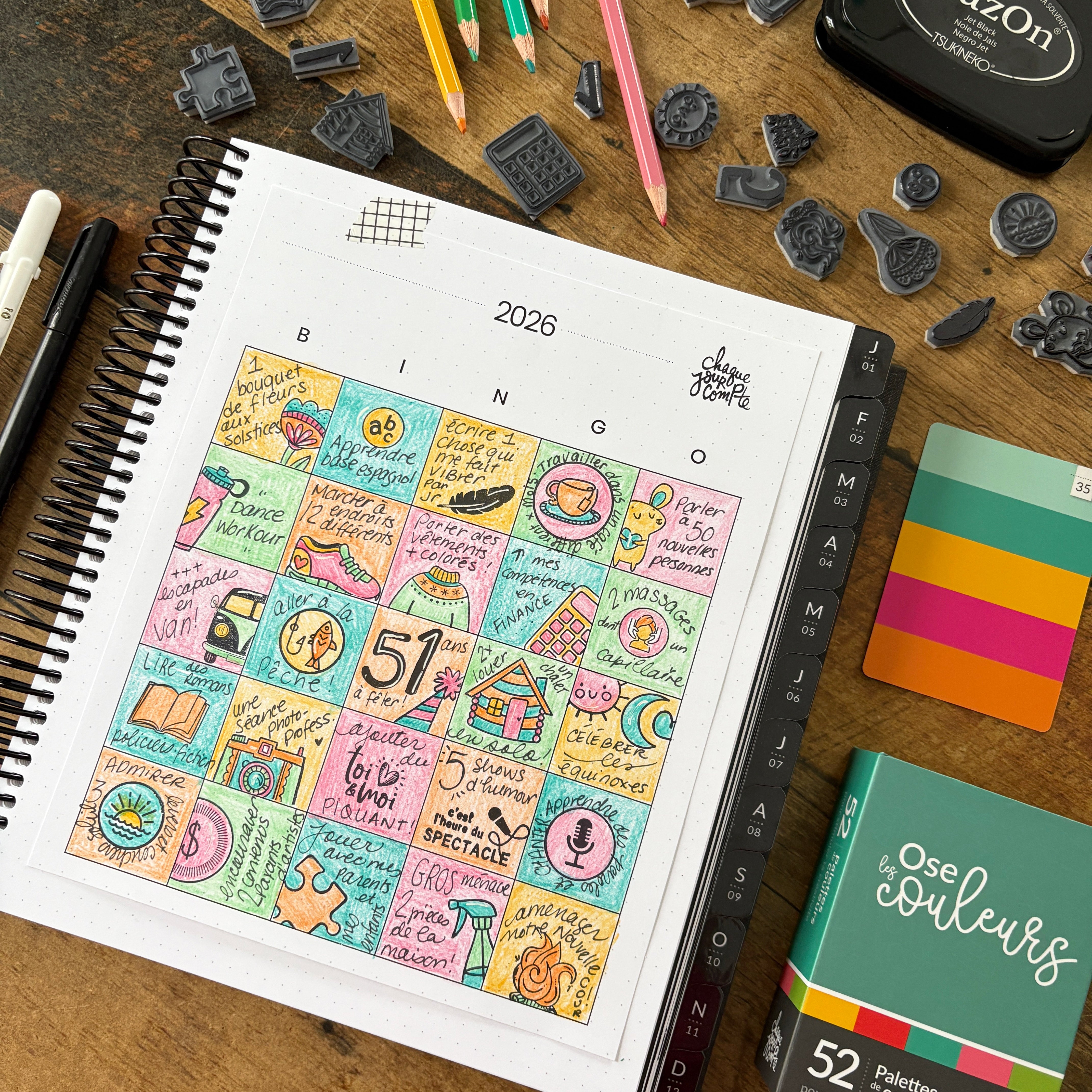 Utilise tes étampes et tes crayons pour créer un bingo à l'image de ce que tu voudrais réaliser cette année